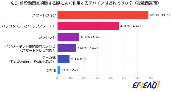 最も多く利用されているデバイスは「スマートフォン」で68.0%(68人)と圧倒的で、持ち運びやすさと即時アクセス性が日常的な視聴を支えています。