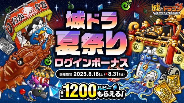 暑い夏を彩る「城ドラ夏祭りミッション」などのイベントを開催!ミッションは8月16日(土)0:00より開催の「前半」と、23日(土)19:00開催の「後半」で分かれており、「夏の転生アバたまチケット」や「水着のお着替え交換チケット」などが獲得できます。さらに最大1,200ルビーが獲得できる「城ドラ夏祭りログインボーナス」や、バッジコインが最大2,500枚もらえる「8月アイテムミッション(バッジ)」も併催!熱い夏を『城ドラ』と共に楽しみ尽くしましょう!