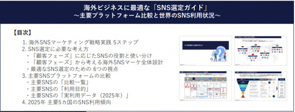 グローバル展開においてSNSは、現地顧客との接点創出やブランド浸透を加速させる不可欠なチャネルであり、戦略的なSNS選定は成果を大きく左右します。本資料では、「SNS選定に必要な6つの視点」や「購買行動フェーズ別SNS活用例」など実務に直結するフレームワークほか、Facebook、Instagram、LinkedIn、TikTokといった世界主要SNSの特徴・利用目的・ユーザー層を比較表にした「プラットフォームの比較一覧」を掲載。