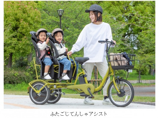 「ふたごじてんしゃ」は、未就学の双子や年子の幼児2人を乗せて公道を走ることができる、日本初で唯一の幼児2人同乗用三輪自転車です(一般社団法人自転車協会の自転車安全基準に適合)。多胎育児では外出や移動が困難だという悩みを解消するため、発案者の双子ママとともに800人以上の双子ママ・パパの要望を取り入れて当社が開発しました。2018年の発売以来、多くの双子家庭で活用されています。2023年には、発売時より要望の多かった電動アシスト付きの「ふたごじてんしゃアシスト」を発売しました。一般的な電動自転車よりもゆるやかなアシストを独自開発し、約5年半をかけ、高い安全性と操作性を実現しています。