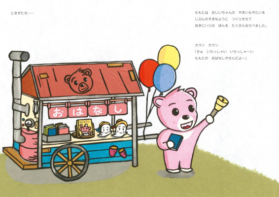 クマのももたがおじいちゃんの屋台ではじめた“おはなしやさん”には、次々とお客さんが訪れます。