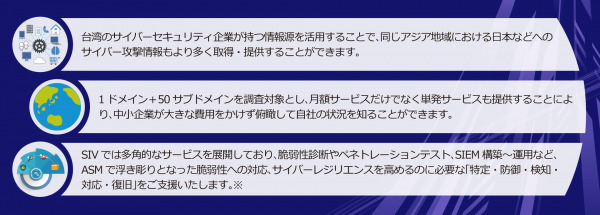 今回の契約締結により、当社がこれまで脆弱性診断や調査サービス提供等で培った知見をもとに、CyCraft社のEASM外部資産エクスポージャー管理プラットフォーム「XCockpit EASM」ソリューションを活用したサービスを展開いたします。対象ドメインの資産を調査し、リスクを精査してレポート作成を行い、ご報告するまでを「SIV-ASMサービス」としてご提供いたします。