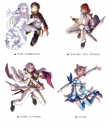 「ナツキ・スバル&エミリア」「ラインハルト・ヴァン・アストレア」「ユリウス・ユークリウス」「フェリス」をはじめ、TVアニメ『Re:ゼロから始める異世界生活』の人気キャラたちが登場!その他の登場キャラクターやイベント情報については特設サイトをご確認ください。
