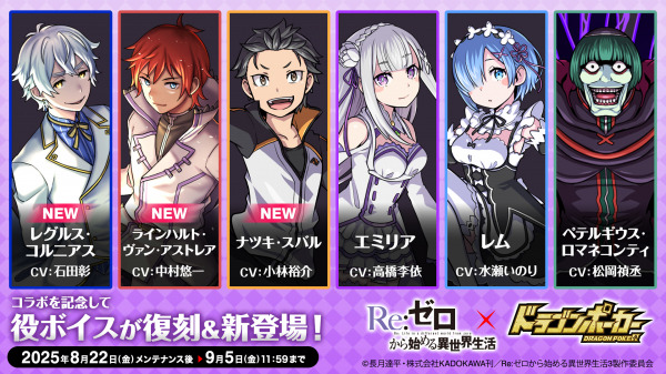 コラボ期間中の限定アイテムとして、「エミリア(CV:高橋李依)」「レム(CV:水瀬いのり)」「ペテルギウス・ロマネコンティ(CV:松岡禎丞)」に加え、新たに「ナツキ・スバル(CV:小林裕介)」「ラインハルト・ヴァン・アストレア(CV:中村悠一)」「レグルス・コルニアス(CV:石田彰)」の役ボイスがアイテムショップに登場します。