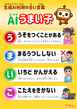 近年、学校現場でも生成AIの活用が急速に広がる一方で、著作権やプライバシーの侵害、誤情報の拡散など、リスクに対する正しい理解が求められています。このような状況を受けて、現職教職員や教育関係者の声を参考に、子どもたちが生成AIを活用するうえで気をつけたい4つのポイントを整理し、その頭文字を使った合言葉「AIうまい子」をポスターにしました。