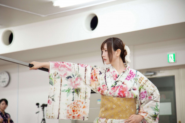 コスプレイヤーのすみれおじさん(紫花菫)が8月2日、総合芸術学校『エンドレス・アカデミー』の特別講座「和装で殺陣」に参加し、浴衣姿で日本舞踊と剣殺陣に挑戦した。