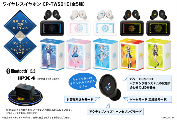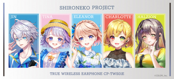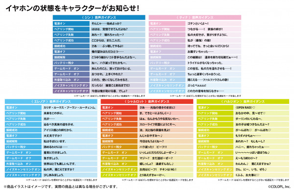 本コラボレーションモデルは、「ジン」「ティナ」「エレノア」「シャルロット」「ハルジオン」の5モデル。充電ケース天面に各魔法陣、左右ハウジングに各キャラクターを象徴するモチーフアイコンを配置。各キャラクターの新規録り下ろしボイスを搭載。電源オンやオフ、ペアリング時やタップ音等のオリジナルボイスを楽しめます。