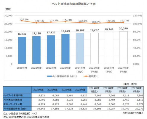 2025年度のペット関連総市場規模は、小売金額(末端金額)ベースで、前年度比100.8%の1兆9,257億円を予測する。
