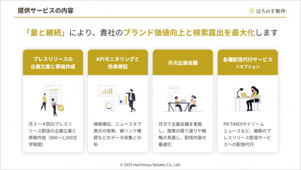 プレスリリース運用支援サービスは、LLMO(Large Language Model Optimization)対策とGoogleが提唱する「E-E-A-T」の強化によりSEO対策にもつながる、プレスリリース配信の企画から、オプションにはなりますが配信の代行までを支援するサービスです。