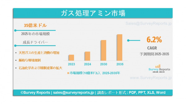 Surveyreportsの専門家による分析によれば、2025年におけるガス処理用アミン市場規模は35億米ドルであった。また、2035年末には市場規模が64億米ドルに達すると予測されている。予測期間である2025年から2035年にかけて、本市場は年平均成長率(CAGR)約6.2%で成長すると見込まれている。