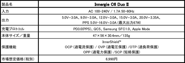 電力技術の世界的リーダーである台湾本社Delta Electronics, Inc.を筆頭とするデルタグループが50年以上にわたって培ってきた専門的な電源管理技術を活かし、Innergie C6 Duo IIは高品質のコンポーネントとすぐれた温度制御技術により、長時間の利用においても持続的に最大出力を確保します。また、Innergie独自の保護技術であるInnerShieldは、OCP(過電流保護)、OVP(過電圧保護)、OTP(過負荷保護)、OPP(過電力保護)、SCP(短絡保護)をサポートし、安定した電力供給を実現、3年間のグローバル保証を提供いたします。