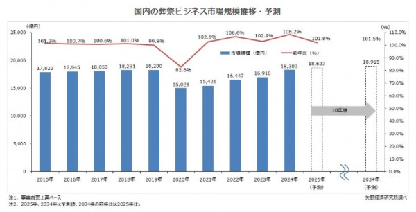 2024年の国内葬祭ビジネス市場規模(事業者売上高ベース)は、前年比108.2%の1兆8,300億円と推計した。