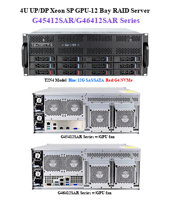 【4U ラックマウント, UP Intel 5/4th Xeon SP, Intel C741 PCH, 12*3.5”/2.5” 12G SAS/SATAリムーバブルベイ, 4*G5 PCIe/CXL1.1(X16)バス, 4*シングルスロットGPU/3*ダブルスロットGPU/2*トリプルスロットGPUサポート, 2*10GbE LAN, 2*GbE LAN, 2600W(@200Vac)/1000W(@100Vac)80Plus チタン規格(1+1)CRPS冗長化電源】