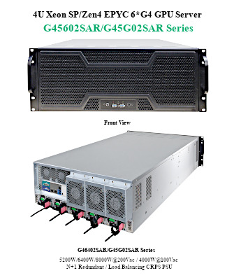 【4U ラックマウント, UP AMD Zen4 EPYC 9005/9004 CPU, AMD sIOD SoC PCH, 2*2.5”G4 PCIe(X4) NVMe内蔵固定ベイ, 7*G5 PCIe(X16)バス, 1*G5 PCIe(X8)バス, 6*シングルスロットGPU/6*ダブルスロットGPU/3*トリプルスロットGPUサポート, 2*10GbE LAN, 5200W(@200Vac)/4000W(@100Vac)CRPS(4+1)冗長化/負荷分散電源】