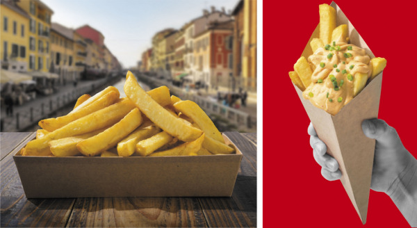パッケージにはベルギー最古の街トゥルネ―を流れるエスコ―川沿いの街並みを描き、本場のフリットコットで提供されるワンハンドで持てる三角すい型のフリッツケースをデザインしています。
