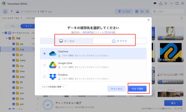 ステップ3.復元したい動画を選択し、SDカード以外の保存場所を選択します。例えばOneDriveまたはGoogle Driveなどのクラウドディスクに保存することを検討してください。