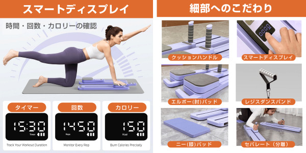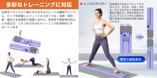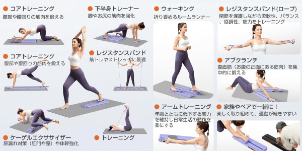 ◎ 多彩なワークアウト :レッグスライダー、コアトレーニング、ケーゲルエクササイズ、アーム・アブクランチなど。