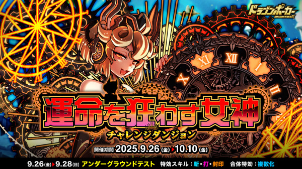 9月26日(金)より、チャレンジダンジョン「運命を狂わす女神」を開催いたします。本ダンジョンでは、覚醒進化した「ダークノルン」がボスモンスターとして登場し、プレイヤーの前に立ちはだかります。フレンドと協力して強力なボスを倒し、レアアイテムを手に入れましょう!