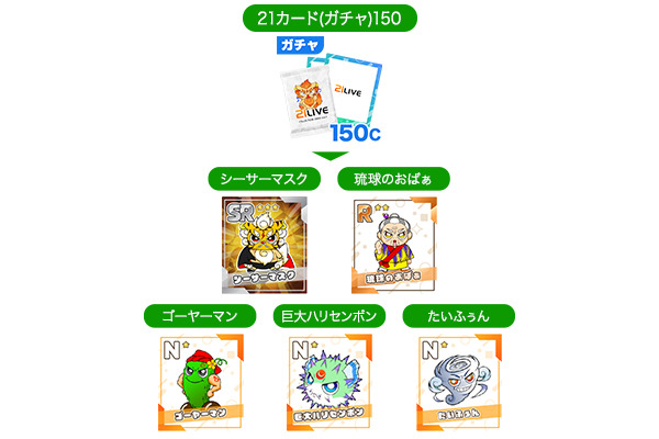 期間中に150Cガチャから登場する全5種類のキャラクターを揃えましょう。1~10回のコンプリート数に応じて「21オリジナル カードフォルダー」や「紅型シーサーの缶バッジ」など、ここでしか手に入らないアイテムをプレゼントします。