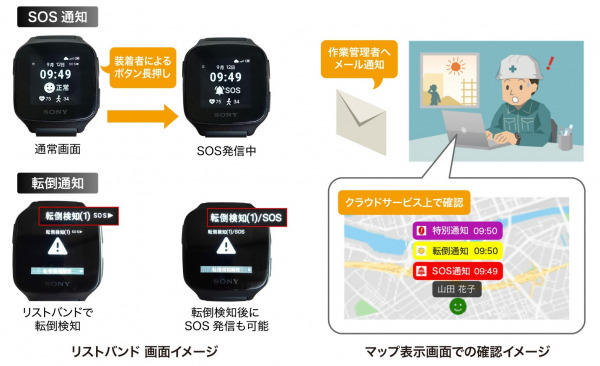 今回の新機能追加により、リストバンド装着者が体調不良などを訴えたいときに、リストバンドのボタンを押すことで作業管理者へのアラート通知を行うことや、リストバンドが装着者の転倒を検知した際に、作業管理者へ自動アラート通知を行うことが可能となりました。作業管理者は専用クラウドサービスにより、装着者の位置情報とあわせてSOS発信や転倒発生の有無および発生時刻を速やかに確認することが可能です。