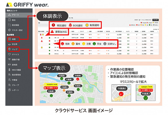 ○心拍数の計測間隔は20秒、専用クラウドサービス上の収集データは1分間隔で更新され、管理画面から心拍数や暑さ指数、SOS発信や転倒発生の状況をリアルタイムで確認可能です。