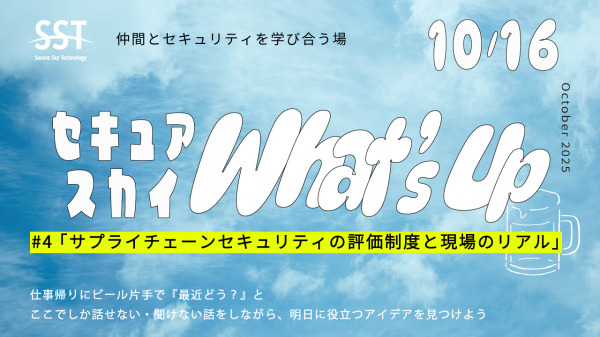 「セキュアスカイ What's Up」は、セキュリティ担当者やセキュアな組織づくりに関心のある方々が集まり、リラックスした雰囲気の中で最新の脅威や対策について意見交換を行うメンバー限定のクローズドなイベントです。参加者同士がここでしか話せない・聞けない情報を安心して共有できる場を提供します。仕事帰りに気軽に立ち寄り、「最近どう?」と挨拶を交わしながら、ビール片手に実務に役立つ新たな視点やアイデアを見つける機会として、ぜひご参加ください。