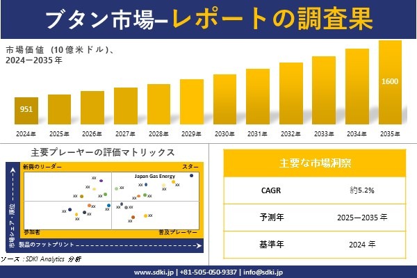 ブタン 市場に関する当社の調査レポートによると、ブタン 市場規模は 2035 年に約 1600億米ドルに達すると予想されています。さらに、2024 年の ブタン 市場規模は約 951億米ドルとなっています。ブタン に関する市場調査レポートでは、市場は 2025-2035 年の予測期間中に約 5.2% の CAGR で成長するとも述べられています。