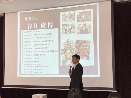 谷川町長からは、宇多津町がめざす「日本で一番住みやすい町」の実現に向けた取り組みについて、町の現状や特色ある施策をご紹介いただきました。講義では学生との対話を交えながら、防災対策として360度スピーカーや水害対策工事、マンホールトイレの設置といった住民の安全を守る取り組みや、香川県で初めて導入されたラウンドアバウト、さらには多世代交流施設「南部すくすくスクエア」など、暮らしやすさと世代間交流を意識した具体的な施策についてお話しいただきました。