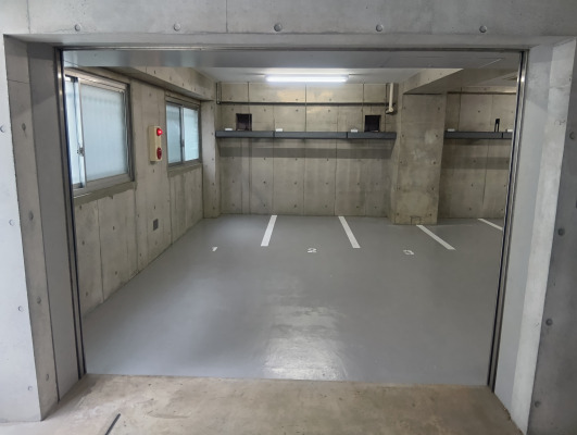 マンション屋内通路に電動シャッターがあり、その内部がバイク施設になります。
