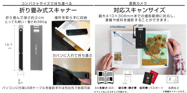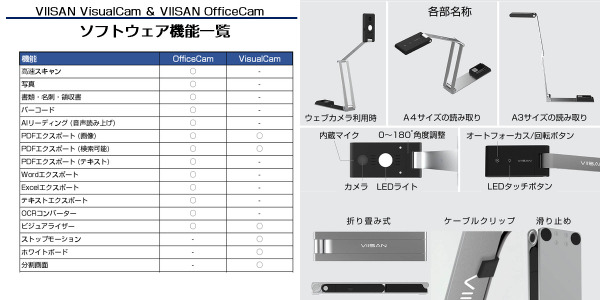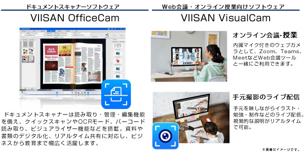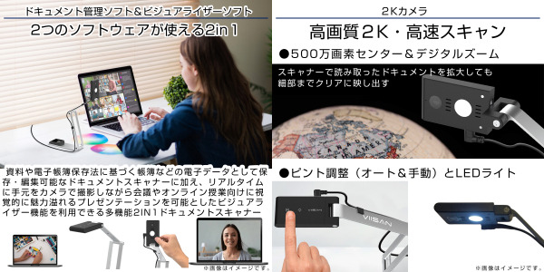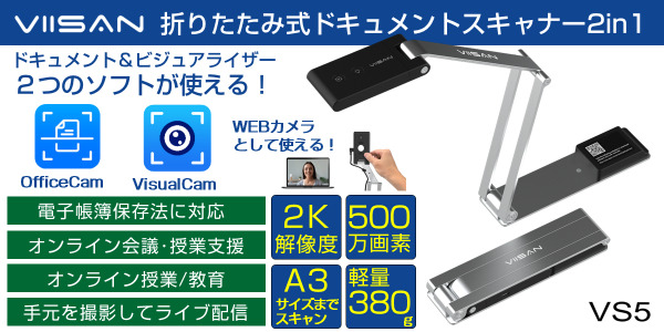 VIISAN「VS5」は、個人・ビジネス・教育現場などで幅広く活用できる多機能スキャナーです。電子帳簿保存法に対応したドキュメントスキャナー機能に加え、手元を映しながらイラスト・勉強・制作などのライブ配信や、オンライン会議・授業を視覚的に支援するビジュアライザー機能を搭載。高画質2K、A3サイズ対応、LEDライト付き。折り畳み式で収納・持ち運びにも便利なコンパクト設計。マイク付きでウェブカメラとしても利用できます。