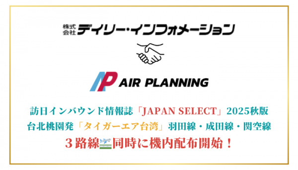 株式会社AIR PLANNING(本社:東京都千代田区平河町1-3-6 BIZMARKS麹町2F)は、台湾最大手LCCであるタイガーエア台湾の機内媒体販売代理店として、株式会社デイリー・インフォメーションが発行する訪日インバウンド情報誌『JAPAN SELECT』を、2025年10月1日より、台北桃園国際空港発の羽田線・成田線・関空線の3路線にて同時に配布開始致しました!