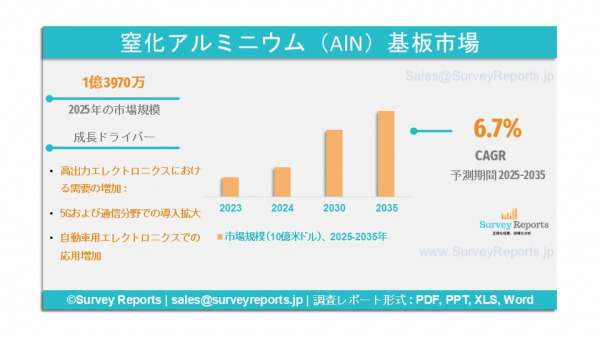 Surveyreportsのアナリストによる定性的な窒化アルミニウム(AlN)基板市場分析によれば、同市場規模の拡大は以下の要因によってもたらされるとされる。すなわち、高出力エレクトロニクスにおける需要増加、5Gおよび通信分野での導入拡大、自動車用エレクトロニクスにおける応用の増加、高性能な熱管理への需要、半導体および電子産業の進展である。窒化アルミニウム(AlN)基板市場における主要な事業者としては、Nanorh、Höganäs AB、湖南福晟科技有限公司(Hunan Fushel Technology Limited)、American Elements、Morgan Advanced Materials、CeramTec Group、Toyal Europe、Surmet Corporationが挙げられる。