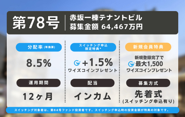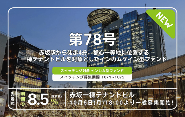 不動産クラウドファンディング「利回り不動産」を提供する株式会社ワイズホールディングス(本社:東京都港区、代表取締役:和泉隆弘)は、新たな投資案件「第78号ファンド(赤坂一棟テナントビル)」の募集を、2025年10月6日(月)18時より先着方式にて開始いたします。