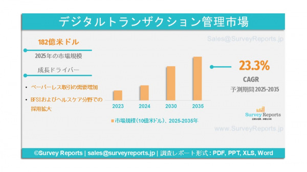 Surveyreportsの専門家による分析によれば、デジタル・トランザクション管理市場の規模は2025年に182億米ドル($18.2 , \text{billion})に達したとされる。さらに、2035年末までに市場収益は989億米ドル($98.9 , \text{billion})に達すると予測されている。予測期間(2025年~2035年)における年平均成長率(CAGR)は約