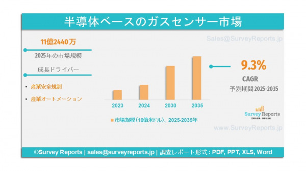 Surveyreportsの専門家による分析によれば、半導体式ガスセンサー市場の規模は2025年に11億2,440万米ドルに達したという。また、2035年末までに市場収益は22億1,730万米ドルに達すると予測されている。さらに、2025年から2035年の予測期間中における年平均成長率(CAGR)は約 9.3%で推移すると見込まれている。