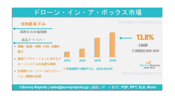 Surveyreportsの専門家によるドローン・イン・ア・ボックス市場調査の分析結果、2025年の市場規模は1,376億米ドルに達しました。さらに、ドローン・イン・ア・ボックス市場のシェアは、2035年末までに3,589億米ドルに達すると予測されています。ドローン・イン・ア・ボックス市場は、2025年から2035年の予測期間において、約13.8%のCAGR(年平均成長率)で成長すると見込まれています。