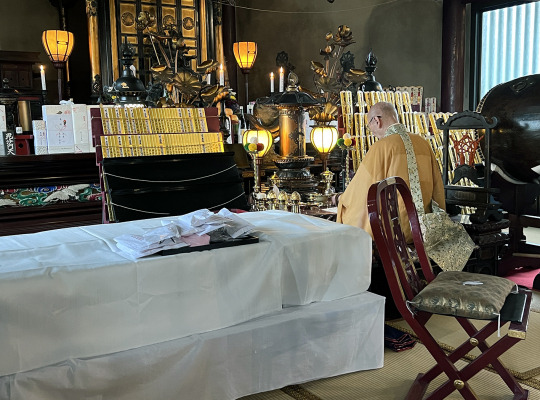 参列者は、一般の方はじめ関係者あわせて30名。供養ご希望のメガネの入った8つの大きな白い箱には白い布が掛けられ、読経いただくお導師様の左横に置かれました。
