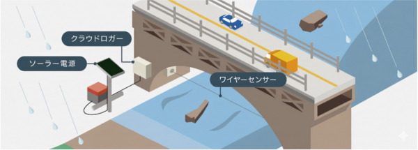 橋梁に設置したワイヤーセンサーで河川の増水や流木を検知し、ソーラー電源と組み合わせることで、電源確保が難しい現場でも24時間の遠隔監視が可能です。この仕組みによって、異常を早期に把握できるため、緊急対応の迅速化や作業計画の最適化が可能となり、全体的な運用効率と安全性の向上に寄与します。