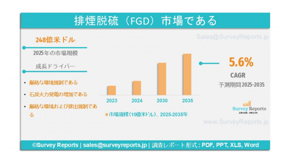 Surveyreportsの専門家による分析によれば、2025年時点で排煙脱硫(FGD)市場の規模は**248億米ドル($24.8,\text{billion})に達している。また、2035年末までには387億米ドル($38.7,\text{billion})に達すると予測されている。予測期間2025年から2035年にかけて、排煙脱硫(FGD)市場は約5.6%の年平均成長率(CAGR)**で成長する見込みである。