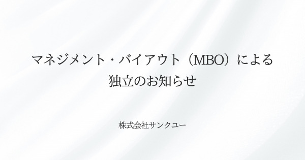 この度、株式会社サンクユー(本社:東京都品川区、代表取締役:堀川治)は、2025年9月16日をもちまして、株式会社バイタリフィ(本社:東京都渋谷区)が保有する当社の全株式を、当社代表取締役である堀川が取得するマネジメント・バイアウト(MBO)を実施し、同社グループから独立いたしましたことをお知らせいたします。