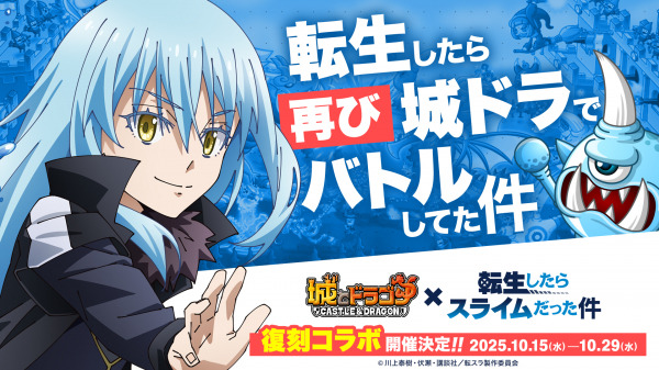 10月15日(水)より『城とドラゴン』にてTVアニメ『転生したらスライムだった件』との復刻コラボイベントを開催することが決定いたしました。コラボ限定キャラとして「リムル=テンペスト」や、城ドラキャラの新しい激レアお着替えが登場するほか、10月10日(金)からXにて「コラボ開催記念!サイン色紙プレゼントキャンペーン」を実施いたします。キャンペーンへのご参加お待ちしております!
