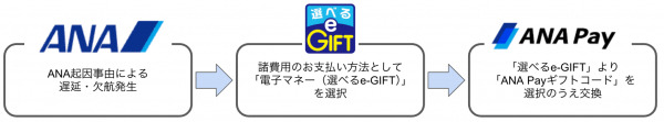 「選べるe-GIFT」の交換先へ「ANA Payギフトコード」を追加することで、ANA便利用時の遅延・欠航等に伴う諸費用(機材故障などANAが起因する事由により遅延・欠航が発生した場合の諸費用のお支払い方法)として、「ANA Payギフトコード」が選択可能となります。