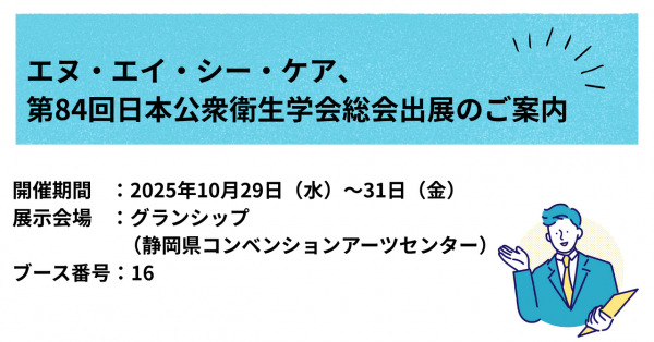 ITを活用したヘルスケア事業を展開する、株式会社エヌ・エイ・シー・ケア(所在地:東京都千代田区、代表取締役:山崎 直人)は、10月29日(水)~31日(金)の3日間、グランシップ(静岡県コンベンションアーツセンター)で開催される「第84回日本公衆衛生学会総会」に出展いたします。