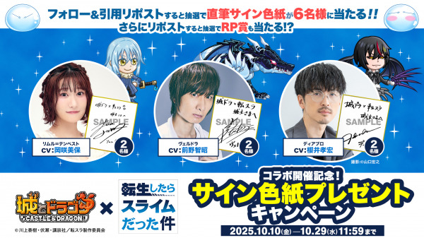 コラボ開催を記念して、「コラボ開催記念!サイン色紙プレゼントキャンペーン」を実施中です。『城とドラゴン』公式Xアカウント(@shirotodoragon) をフォローし、キャンペーン対象ポストを公式リポスト、またはハッシュタグ「#城ドラ転スラコラボ」をつけて引用リポストされた方の中から抽選で各賞品をプレゼント!ぜひ引用リポストする際はハッシュタグとあわせて、「コラボイベントの感想」や「楽しんでいるポイント」などもコメントしてみてください!