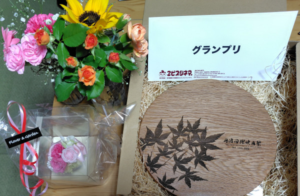 約30作品の中、監督の舞台挨拶15作品中、「~運送ドラゴン~パワード人間バトルクーリエ」の大東賢監督の舞台挨拶も2日で6回というハードなスケジュールで行われ、6回の上映と舞台挨拶に参加されたお客様、応援されたお客様からお祝い品や花束、お祝い金が大東賢監督に贈呈されました。