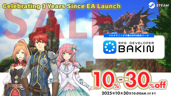 アーリーアクセス版の配信開始から三周年を迎えることを記念して、本日よりSteamストアにて『RPG Developer Bakin』やDLCがお買い得になる「アーリーアクセスローンチ三周年記念セール」を開催します。また、セール対象の製品を含むバンドル版にも本セールの割引が適用され、さらにお得になります。この機会をお見逃しなく!