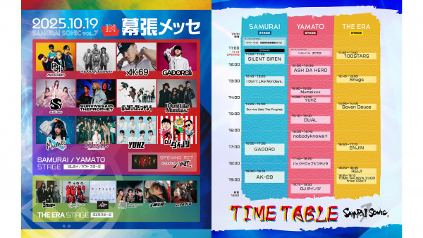 2025年はSAMURAI SONIC史上最多19組のアーティストが出演し豪華なラインナップとなっています。注目のタイムテーブルも発表されています。