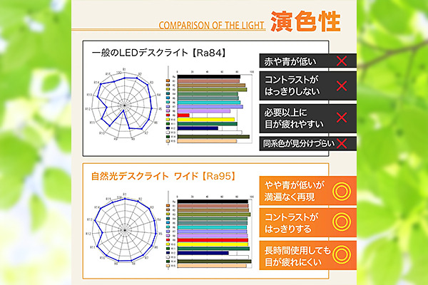 ● 高演色(Ra95以上):色彩・文字を忠実に再現し、読書やデザイン作業の精度を高める。