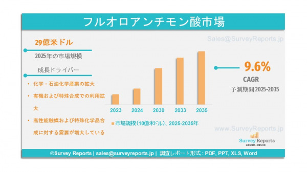 Surveyreports社の専門家によるフルオロアンチモン酸市場の分析によれば、2025年時点での市場規模は29億米ドル($2.9\ \text{billion}$)であった。さらに、2035年末までに市場収益は98億米ドル($9.8\ \text{billion}$)に達すると予測されている。予測期間である2025年から2035年にかけて、市場は年平均成長率約9.6%($\text{CAGR} = 9.6%$)で拡大する見込みである。
