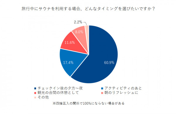 「チェックイン後の夕方~夜」60.9%、「アクティビティのあと」17.4%、「観光の合間の休憩として」11.6%、「朝のリフレッシュに」8.0%、「その他」2.2%という結果でした。